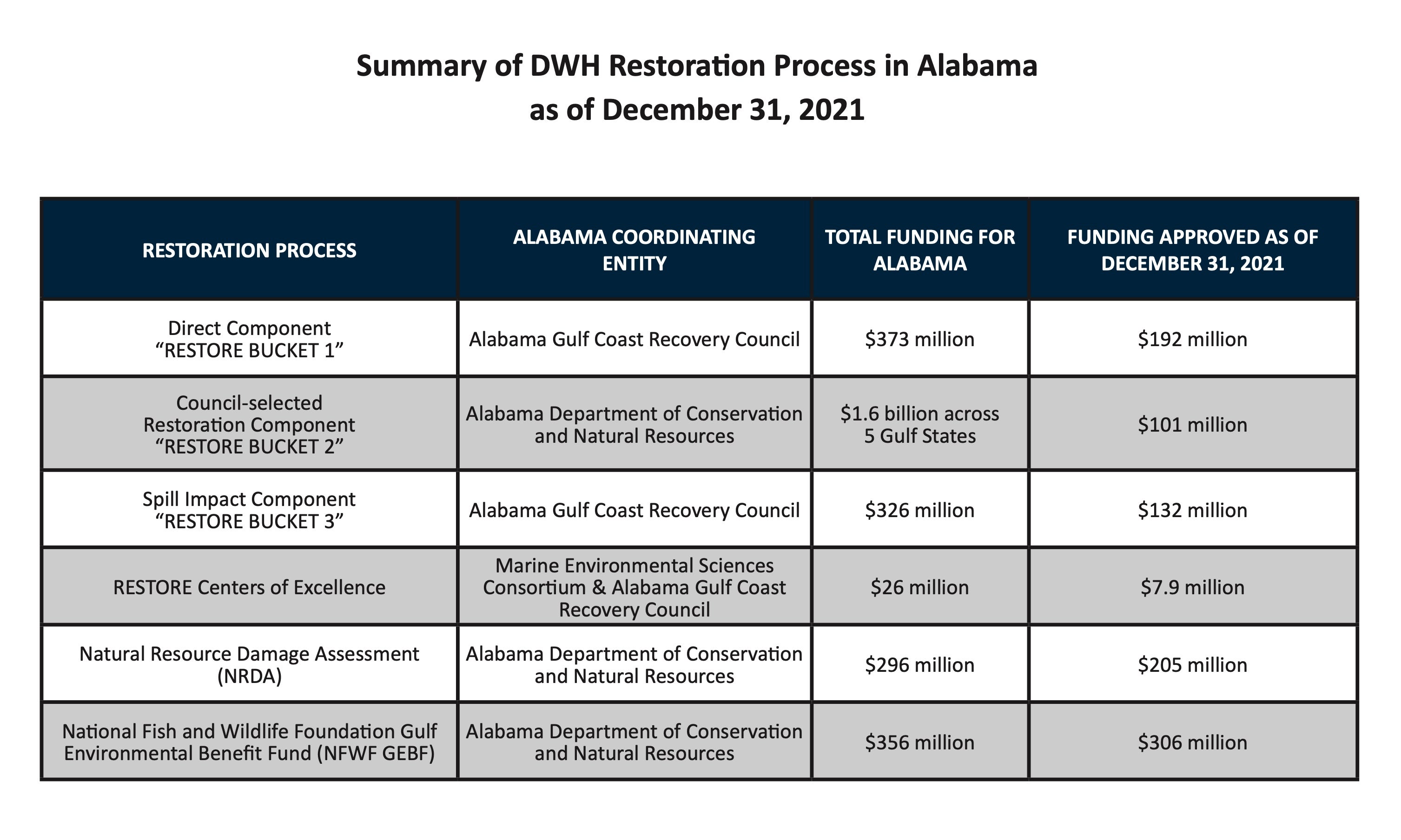 The Governor, along with the Alabama Department of Conservation and Natural Resources and the Alabama Gulf Coast Recovery Council is tasked with overseeing this funding for the benefit of Alabama’s natural resources and economy. Restoration is well underway in the state, with projects being funded across a wide-array of goals that, collectively, will significantly contribute to the improvement of Alabama’s coastal resources and strengthen our State economy while improving the health and resiliency of our coastal communities.