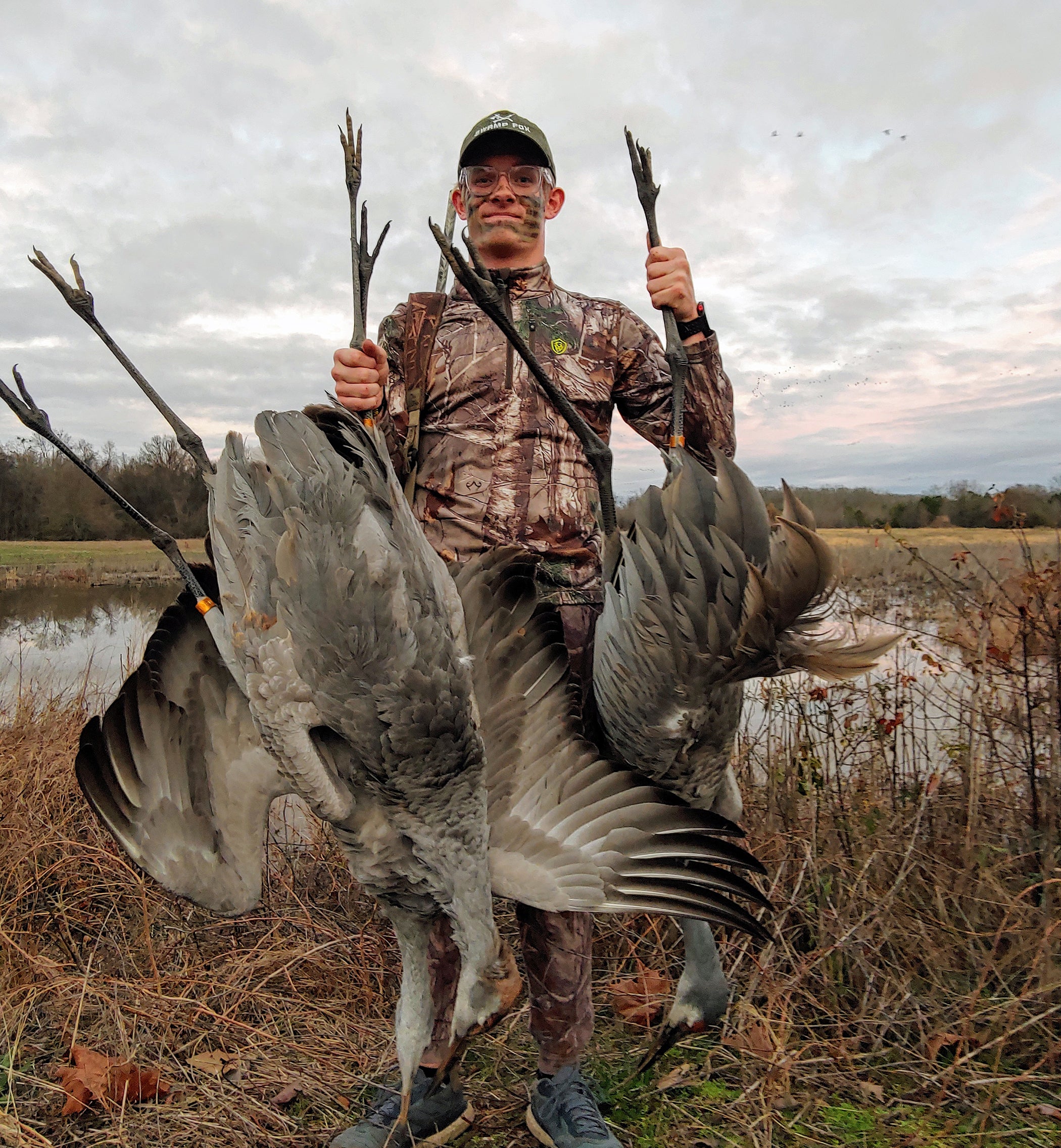 “When we got there, there must have been between 200 and 300 sandhills in the field,” Jason said. “After we got set up, three birds came in and I doubled up.”