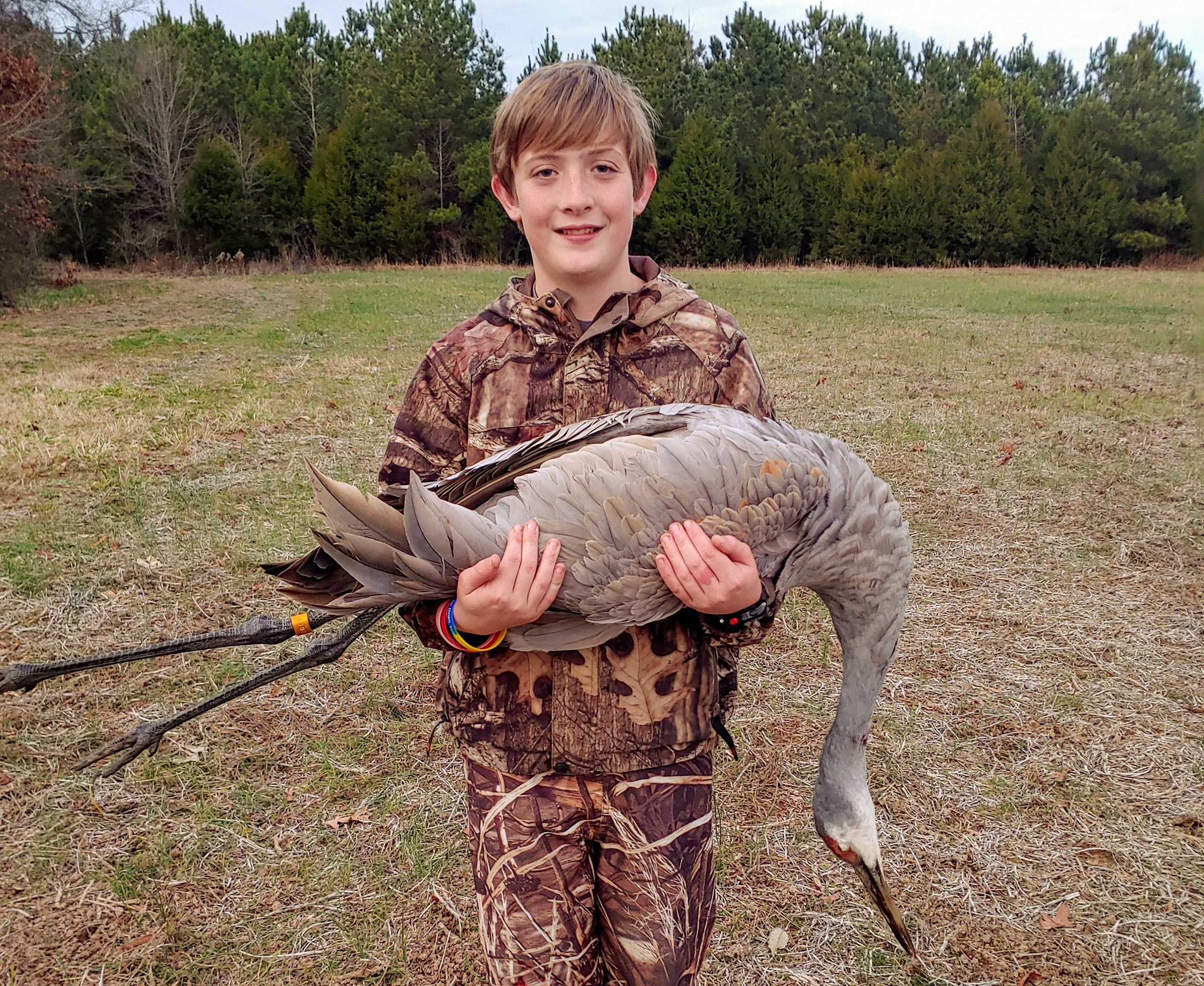 “We had put out full-body goose decoys to try to kill a few geese while we were there,” Jason said. “It was interesting that the cranes seemed to be skirting our decoys. We decided either we were going to have to move or do something different. We made the decision to pull all the goose decoys. By the time we pulled the last goose decoy and got back in the blind, we had a pair of sandhills at 15 yards. My son rolled his out, and we were done. It could have been coincidence that we pulled the goose decoys and we killed one, but I feel like they flared off of the full-body goose decoys.