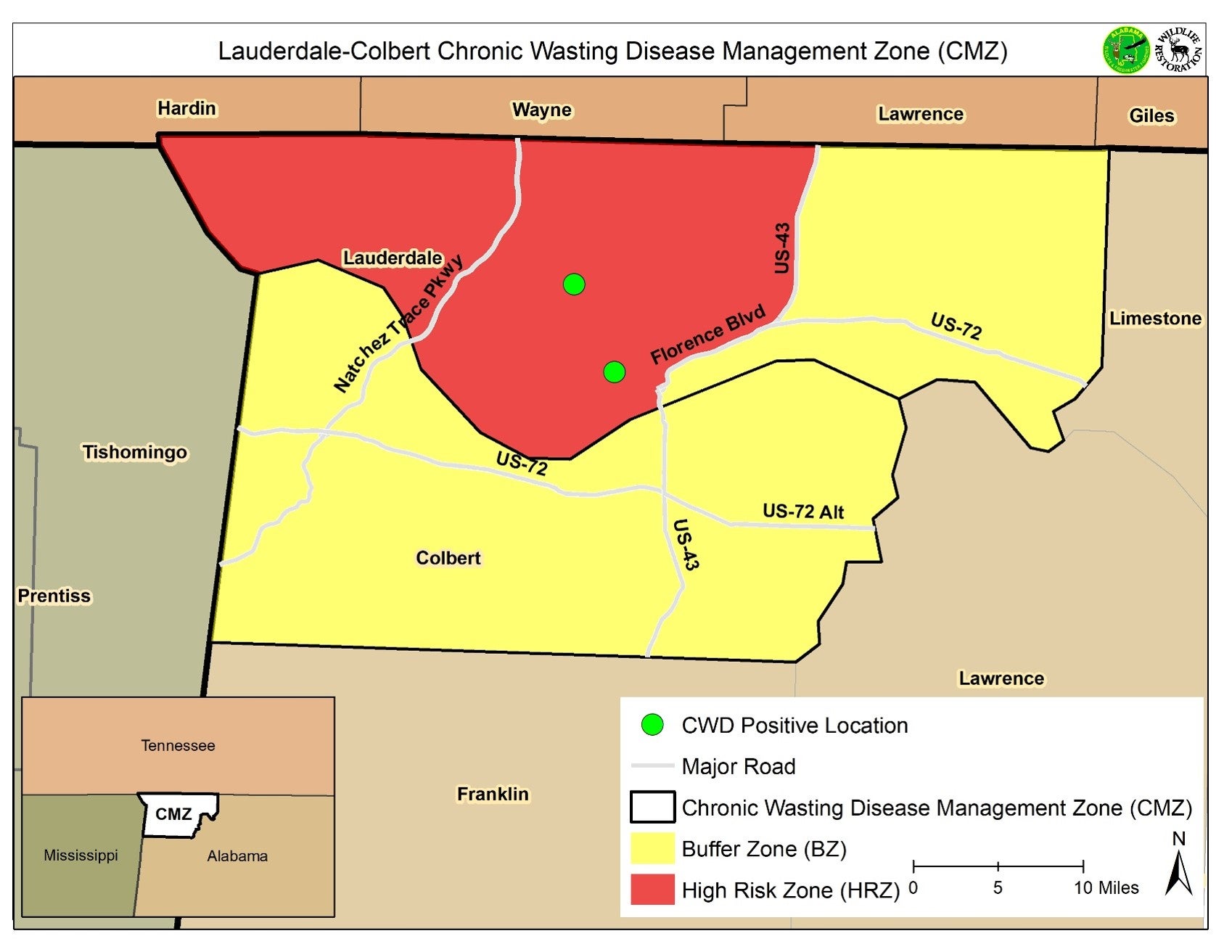 When the first case was confirmed on January 6, an emergency regulation was signed the next day to establish the CWD Management Zone (CMZ) in Lauderdale and Colbert counties, encompassing the high-risk zone (HRZ) of Lauderdale County west of U.S. Highway 43 and the buffer zone (BZ), the remaining area east of Highway 43 in Lauderdale County and all of Colbert County. The emergency regulation also extended the either-sex deer season on all open permit, private, and WMA lands, removed the seasonal and daily bag limits for antlered and unantlered deer, and removed the antler restriction for deer harvest in the CMZ. It became mandatory for any deer harvested within the HRZ to be made available for sampling. Hunters were strongly encouraged that deer harvested in the BZ be sampled. Carcass restrictions were also put in place that prohibited the transport of deer carcasses and deer parts in the CMZ. Deer harvested in the HRZ must remain in the HRZ, and deer harvested in the BZ must remain in the CMZ.