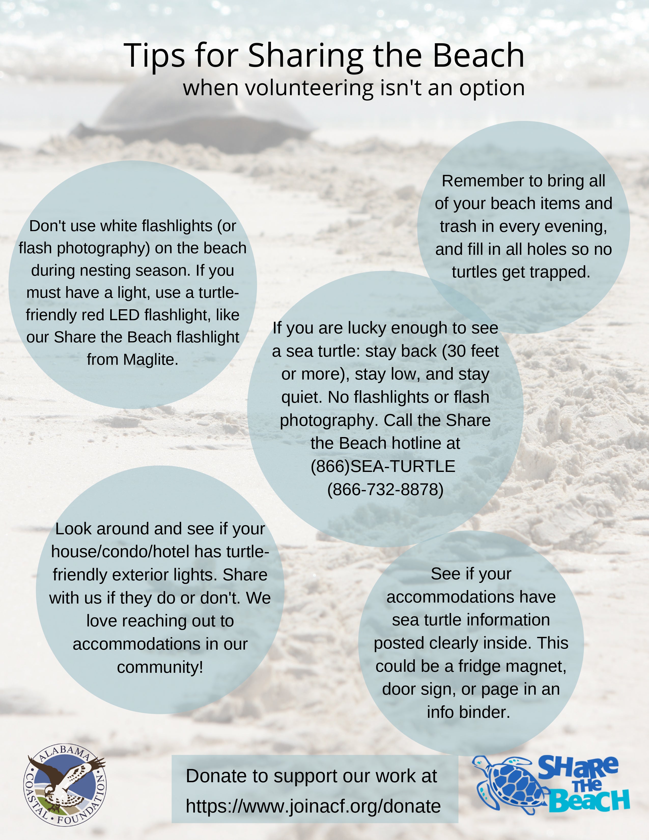 Share the Beach was formed in 2005 by the Friends of the Bon Secour Wildlife Refuge in Gulf Shores. In 2018, the Bon Secour group asked the Alabama Coastal Foundation (ACF) to oversee the program, abiding by protocols set by the U.S. Fish and Wildlife Service under the federal endangered species recovery permit, which allows volunteers to help protect the nesting sea turtles and their habitat.