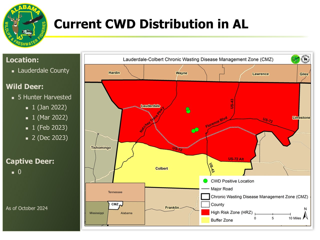 The most recent CWD positive tests were confirmed in two deer in December 2023. After the first deer with CWD was confirmed in January 2022, an emergency regulation was signed to establish the CMZ in Lauderdale and Colbert counties. Since then, the HRZ was expanded to include all of Lauderdale County. Carcass restrictions were also put in place that prohibit the transport of deer carcasses and deer parts in the CMZ. Deer harvested in the HRZ must remain in the HRZ, and deer harvested in the Buffer Zone must remain in the CMZ.