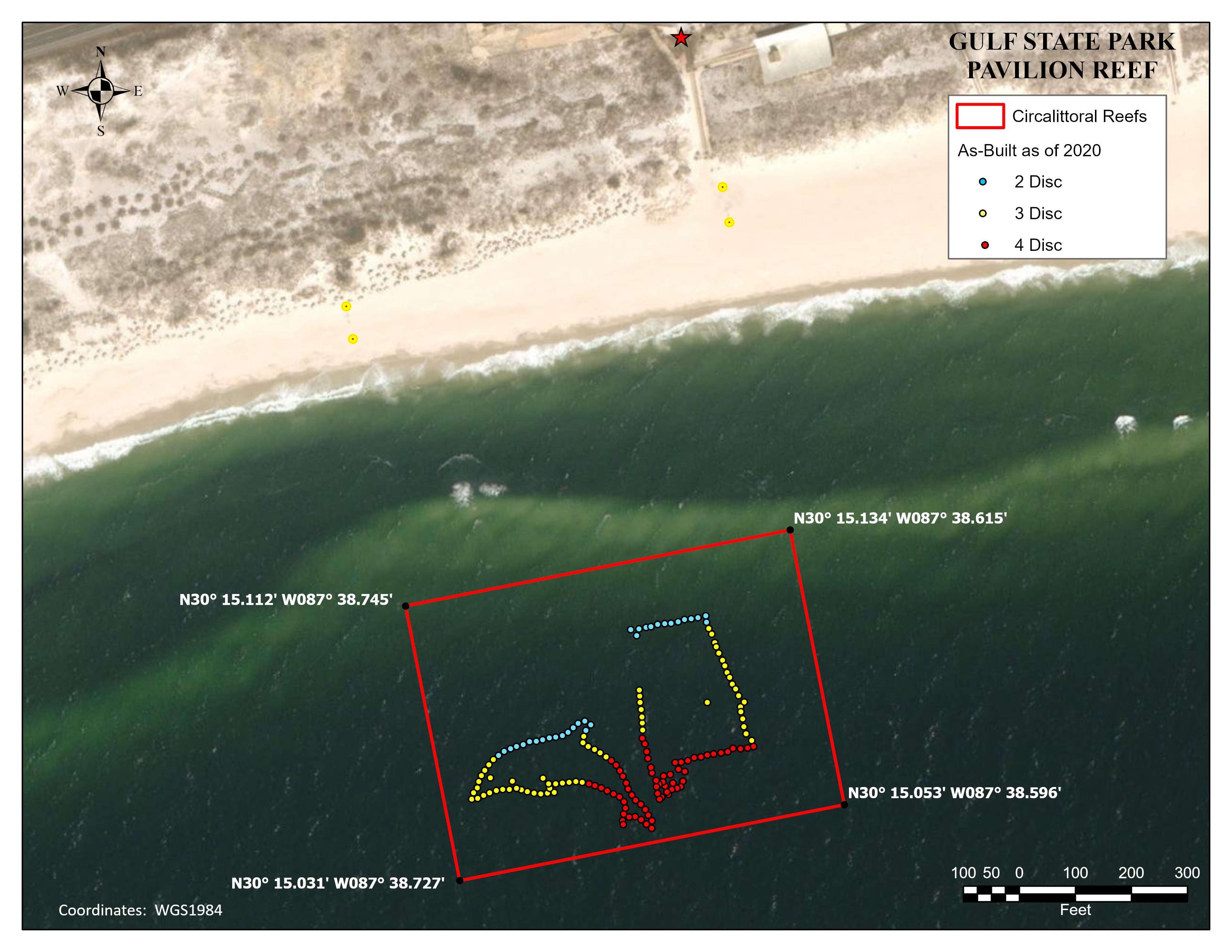 The circalittoral reefs are located at three Gulf State Park Beach Access Sites (Pavilion, Romar Beach and Alabama Point). The reef structures are approximately 500’ from shore with depths as shallow as eight feet. There is a vertical clearance of six feet above the structures to allow for boats to pass over. The longitudinal boundaries of each reef is marked by a sets of poles located on the shore. The rear poles are yellow with red stripes and the front poles are yellow only. From the water, you can determine your relation to the reef by looking at the alignment of the poles. Red lights installed on each set of poles will provide a point of reference at night. However, the lights may be turned off during sea turtle nesting season.