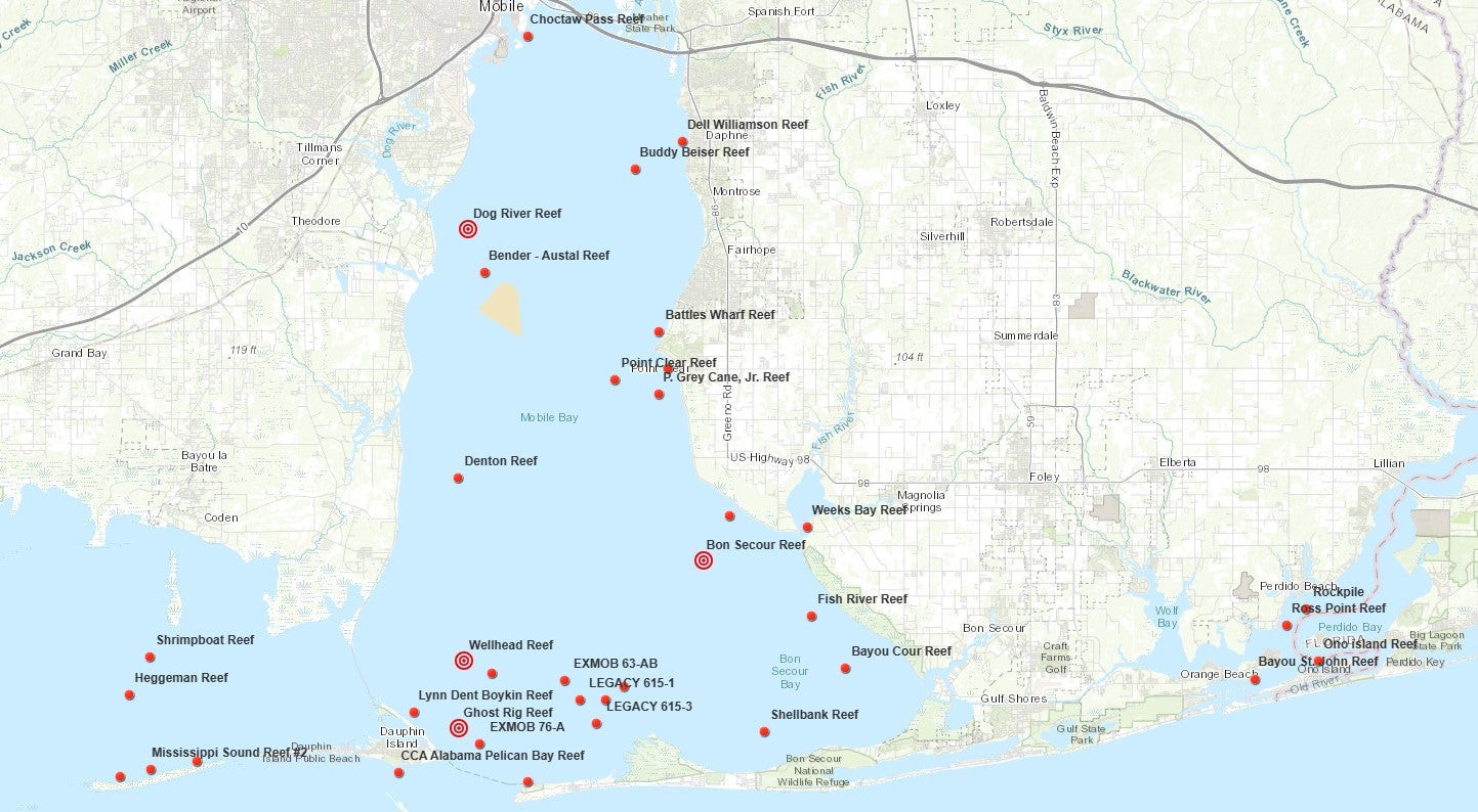 Other artificial reefs have been constructed outside of those associated with the three large projects described above. Reefs along the west end of Dauphin Island, Pelican Bay, Weeks Bay, and Perdido Bay have been constructed through partnerships with the Fish and Wildlife Service’s Sport Fish Restoration program, Coastal Conservation Association of Alabama, and the Alabama Wildlife Federation. Without these partnerships, Alabama’s inshore anglers would not have the fishing opportunities available today. The Marine Resources Division remains committed to creating and enhancing habitat to support important marine fish populations and will continue to foster relationships with organizations and individuals to advance projects that will add to the 34 inshore reefs previously constructed to date.