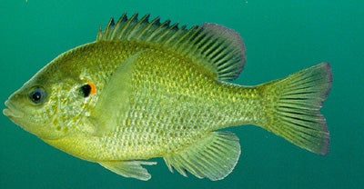 CHARACTERISTICS: Locally known as shellcracker, redear sunfishes are one of Alabama’s least colorful but most sought after sunfishes. The back on this species is light green to brown with scattered darker spots. The light gray to silver sides have 34 to 43 lateral line scales. Lower surfaces of the head and venter are light yellow to white. Sides of the head are mottled with brown to dark orange spots. The dorsal fin is light gray with nine to 11 spines and 10 to 12 rays. The light yellow to white anal fin has three spines and 12 to 14 rays. The pectoral fin has 13 or 14 rays and it is long and pointed, its end reaching past the nostril when bent forward. The common name of this species is derived from the characteristic red or orange spot at the rear of the opercular flap.
