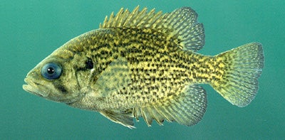 The shadow bass, locally known as goggle-eye, was regarded as a subspecies of the rock bass until Cashner and Suttkus (1977) gave it full species status. Members of this species have from 36 to 42 lateral line scales. The dorsal fin has 11 spines and 11 or 12 rays; the anal fin has six to seven spines and 10 or 11 rays. The cheek has five to six rows of scales. The mouth is large, with the upper jaw extending to about the middle of the eye. Shadow bass in Alabama are usually olive to light brown, and their sides are frequently marked with two to four dark brown vertical bands and blotches. Vertical fins are clear to light yellow with black and gray mottling. The iris of the eye is red or reddish orange.