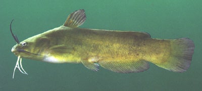 Locally known as yellow cat, the yellow bullhead is distinguished from the black bullhead, Ameiurus melas, by its white or yellow chin barbels, 24 to 28 rays in a straight-edged anal fin, and five to eight fairly large teeth on the posterior edge of each pectoral spine. The rear edge of the caudal fin is straight or slightly rounded. The back is yellow, olive, or dark gray, grading from light yellow to white on the venter. The fins are light to dark gray, and they may have light to darkened margins.