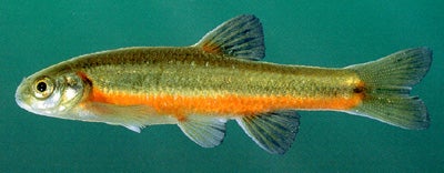 CHARACTERISTICS: Is a short species with a round body form in profile. The head is small, blunt, and rounded. Breeding males are striking, with lower sides that become flame red while their venters remain light. In each individual, the anterior base of the dorsal fin has a red spot, and the light olive back and sides are streaked with golden brown. A dark lateral band runs between the golden stripes, ending in a small but separate spot at the base of the caudal fin. See Jordan (1878a) for original description.