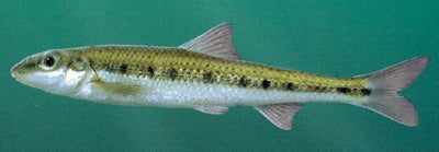 CHARACTERISTICS: Has a slender, terete body that is slightly depressed in cross section. Its blunt, rounded snout extends beyond the upper lip, and its eye is smaller than the snout. The mouth is small, horizontal, and inferior, containing a small barbel in each corner. The sides are typically marked with nine or 10 dark, horizontally elongate blotches that are about the same size as the pupil of the eye, while lateral line scales usually number more than 46. This species is distinct from the similar blotched chub, E. insignis, which is shorter and more robust, has vertically elongate blotches, and usually has 43 or fewer lateral line scales.