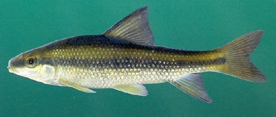 CHARACTERISTICS: The largest chubsucker in Alabama, the sharpfin chubsucker usually has a pointed dorsal fin, but the fin may become rounded on large individuals. The anal fin is almost always pointed, and when depressed, its longest rays extend beyond the caudal fin base. The body has 40 to 45 lateral scales but no lateral line. Large breeding males have four large, often hooked tubercles on each side of the head. Young sharpfins are brown on the back and cream on the venter, with a light yellow lateral band above a dark lateral stripe extending from the snout to the caudal fin base. As the fish ages, the lateral stripe disappears. Many scales are edged in black, giving them a diamond-shaped appearance. Fins are dusky overall, with rays outlined in black.