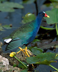 The purple gallinule is a brightly colored marsh bird comparable in size to a chicken. The adult birds length is around 12 inches. Adults have green/olive backs and wings. The head, neck, breast and belly are an attractive blue/purple. The undertail coverts are white, eyes are red, and the beak is red with a yellow tip. The forehead is covered by a light blue shield. Feet and legs are bright yellow. The sexes are similar is coloration. Wingspan is normally around 21 inches and weights range from below 7 ounces to slightly over 10 ounces. The adult has a red bill with a yellow tip. The purple gallinule is a poor flyer but is an excellent wader. Long toes allow this bird to maneuver about in its aquatic environment and provide a stable platform while walking across floating vegetation. Vocalizations include a Kr-r-ruk, kek, kek, kek and chucks.