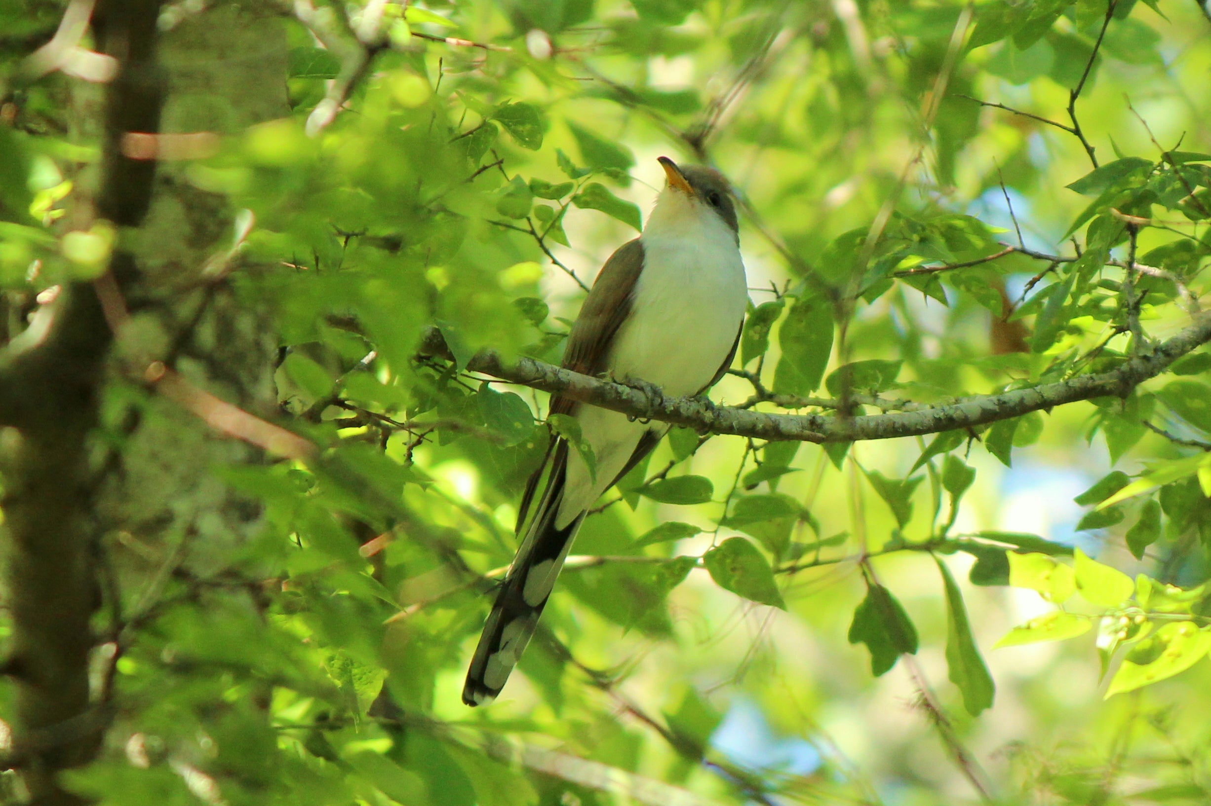 Yellow-billed cuckoos (Coccyzus americanus) are long slender, secretive birds about the size of a mourning dove. They have pure white bellies and the upper portions of their bodies are dark brown. Their wings are somewhat reddish-brown. Their tails are very long and have large white spots on the underside. The lower portion of their beak is yellow, while the upper portion is black. One of their calls consists of a rapid series of about fifteen cuks, which gradually slows at the end. A second call is a single, deep, prolonged cooo. The yellow-billed cuckoo and the black-billed cuckoo are said to call more often just before it rains; hence, they are commonly called “rain crows”. They usually remain motionless when perched, and may go unnoticed unless they call or fly.
