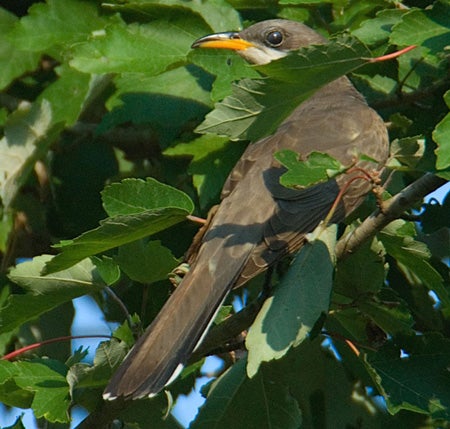 Yellow-billed Cuckoos are great destroyers of caterpillars, readily eating the hairy types disdained by most other birds. Their stomachs often become so felted with caterpillar hairs that the bird sheds the lining and grows a new one. They also eat large numbers of beetles, bugs, locusts, grasshoppers, assorted other insects, and even small tree frogs. Occasionally, they will eat the eggs of other birds, and often eat small fruits such as blackberries.