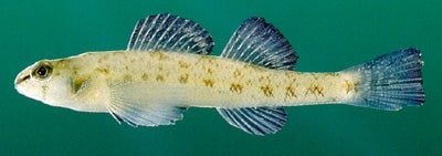 CHARACTERISTICS: The Choctawhatchee darter is characterized by a body speckled with seven to 10 dark mid-lateral black and brown markings in W-, X- and M-shapes. Six narrow saddles cross the back and a bridle extends forward from the eyes, encircling the snout. Etheostoma davisoni is similar in appearance to the bluntnose darter, E. chlorosomum, from which it can be distinguished by the bridle of pigment extending over and around the snout. In E. davisoni the bridle is thinner and is confined almost entirely to the tip of the snout, while in E. chlorosomum, it is wider and extends slightly onto the upper lip. The body is the color of straw with an occasional light green wash along the back. The venter and breast are white. Dorsal and caudal fins are banded with light brown. Breeding males are generally dark with pigment spots over the body. Although also similar to E. stigmaeum, E. davisoni lacks nuptial coloration and breeding tubercles in males, and its cheek is completely covered with scales.