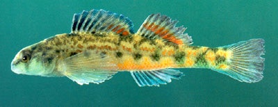 CHARACTERISTICS: Breeding males of the Tombigbee darter are distinguished from those of other Ulocentra species by having slightly oblique, dark green bars with bright orange interspaces along the side and caudal peduncle. Color along the back and upper sides is variable, consisting of red-orange in a loose network pattern rather than discrete blotches. The snout, lips, gill membranes, lower gill covers, and breast are green or turquoise. The anal fin is generally deep turquoise, while the caudal fin has turquoise margins and a pale turquoise or nearly clear central portion. See Suttkus et al. (1994) for original description.