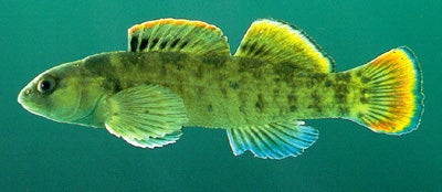 CHARACTERISTICS: The Tuskaloosa darter is distinguishable from other members of the Etheostoma jordani species group (see greenbreast darter species account) by the lack of red spots along the sides, absence of scales on the opercles, and by having no red pigment on the lips and anal fin. The body of breeding males is olive with a weakly formed pattern of three to 11 dark vertical bars along the sides. The back has eight or nine olive to brown blotches. Lower parts of the head, breast, and gill membranes are turquoise. The spiny dorsal fin has a clear to white margin with a submarginal red band most prominent on the front of the fin. The caudal fin has a narrow turquoise or black margin followed by a yellow band, which precedes a broad red band.