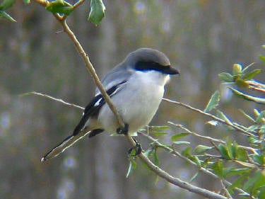 A medium sized songbird (8-10 inches long) that regularly preys on small mammals and other songbirds; similar to the mockingbird in size and coloration. The head is bluish gray with a black mask surrounding the eyes and extending from the neck to the bill. The wings are black with a white patch on the primaries and the tail is black with white edges. The most distinguishing feature of this bird is its black hooked bill, which is slightly notched, hooked like a falcon and used to kill prey. The feet lack sharp talons, like hawks, but are strong with sharp claws. Males are slightly larger than females.