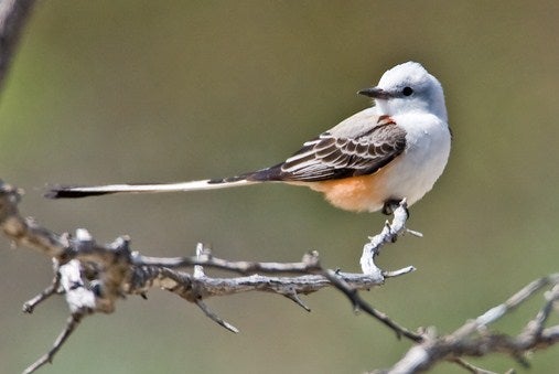 Scissor-tailed Flycatchers are large flycatchers that reach 14 inches long. Half of their total body length is a deeply forked black and white tail that is nearly unmistakable. Adult flycatchers are grayish white birds on their head, back, and breast, with salmon-pink sides and bellies. They have dark grey-black wings as well. Females tend to be shorter than males with shorter tails as well. Young flycatchers have smaller tails and are gray-white all over.
