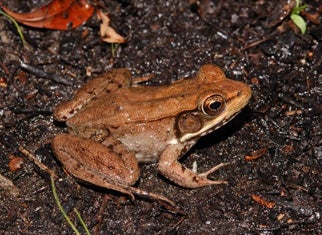 Common statewide, this highly aquatic and familiar frog is bronze (L.c. clamitans) in southern and green (L.c. melanota) in northern Alabama. Breeds April to August. Prefers swamps, small streams, and other aquatic habitats. Lowest Conservation Concern.
