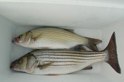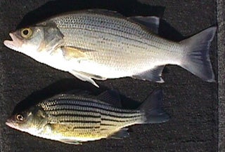 A hybrid bass or "wiper" is shown on above and a striped bass shown below from Lake Jordan on the Coosa River.