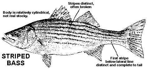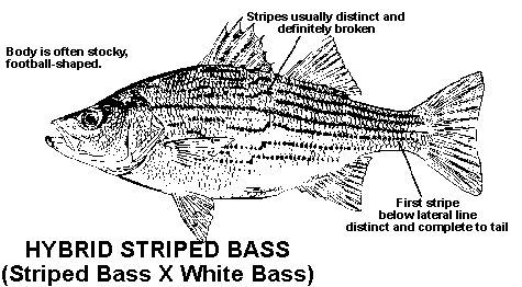 Some striped bass may have broken lines, but the stripes of a fresh hybrid are distinct and definitely broken. The shape of the head can be a distinguishing characteristic between the striped bass and the hybrid bass (wiper).