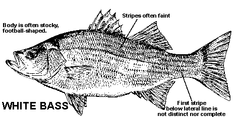 White bass can be identified because they have a single center tooth patch, and their stripes are faint. On a white bass, the first stripe below the lateral line is not distinct nor complete to tail.