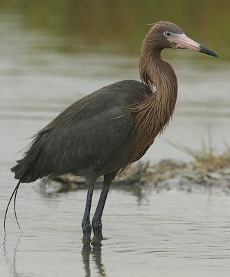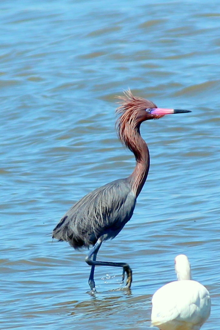 An intermediate-sized (76 cm [27-30 in.]) heron smaller than the great egret, but larger than the similar little blue heron. Color phases include dark adults that are deep reddish-chestnut brown on head and neck and slaty blue on body, and light adults that are all white. Adults in breeding plumage have long plumes on back, shaggy plumes on head and neck, black-tipped bills with a bright pink base, violet lores, cobalt blue legs, and black feet. At other times adults have bicolored, dark-tipped bill with a light base, and blackish legs and feet. Dark phase immatures paler than adults, appearing gray-blue with some pale cinnamon on the head, neck, and inner wing (Palmer 1962, Paul 1991). During breeding season, low guttural raaahcalls are given during threat displays and soft crog-crog calls may be exchanged between displaying adults (Palmer 1962). Three subspecies described: the nominate eastern North American and West Indian race, E. r. rufescens, the more western, E. r. dickeyi, and the Central American, E. r.colorata (Palmer 1962). However, validity of those other than the nominate race questionable (Paul 1996).