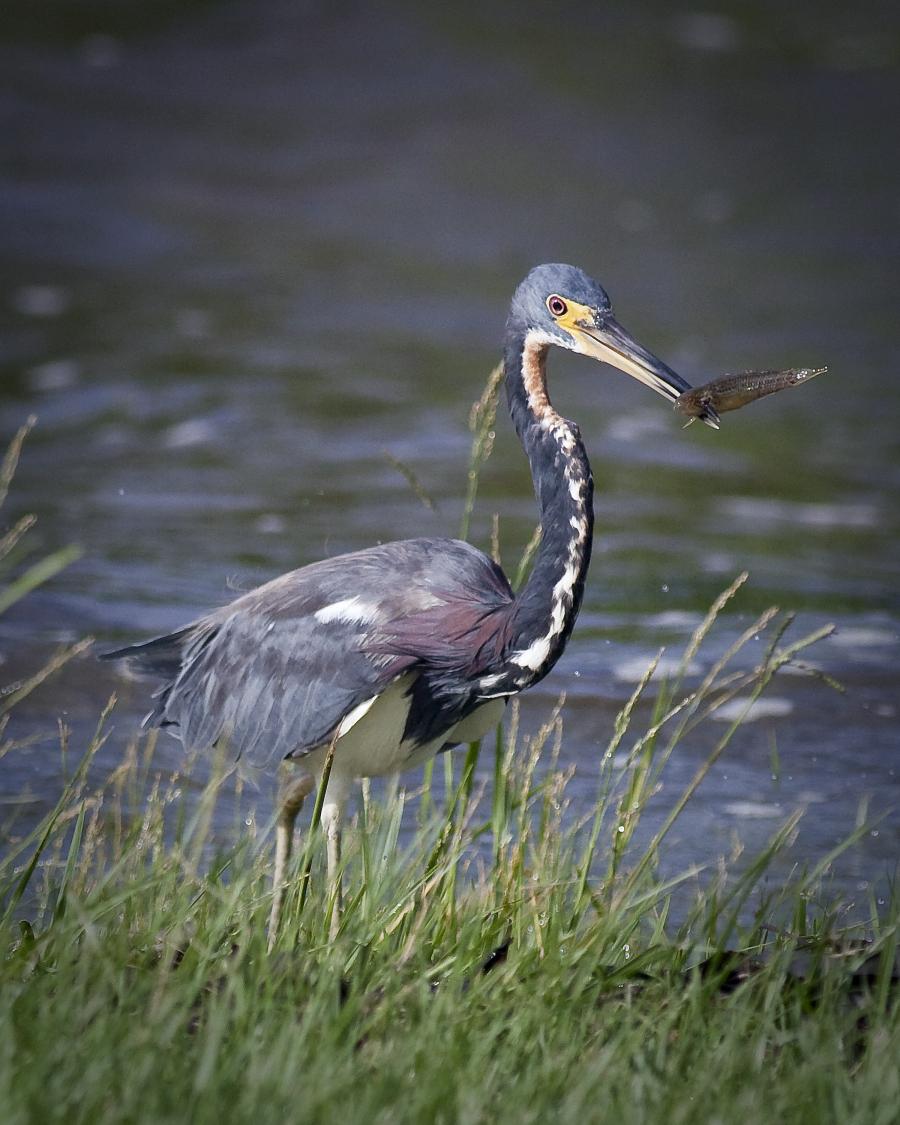 Herons preys upon small animals associated with wetland habitats, such as small fish, shrimp, tadpoles, insects, reptiles, and amphibians. While feeding, the tricolored heron can be seen standing in shallow water searching for food. Once prey is spotted, the heron tends to run toward it with wings open. This technique is not the only one used by this heron. It tends to change its stalking tactics in order to capture its favored prey.