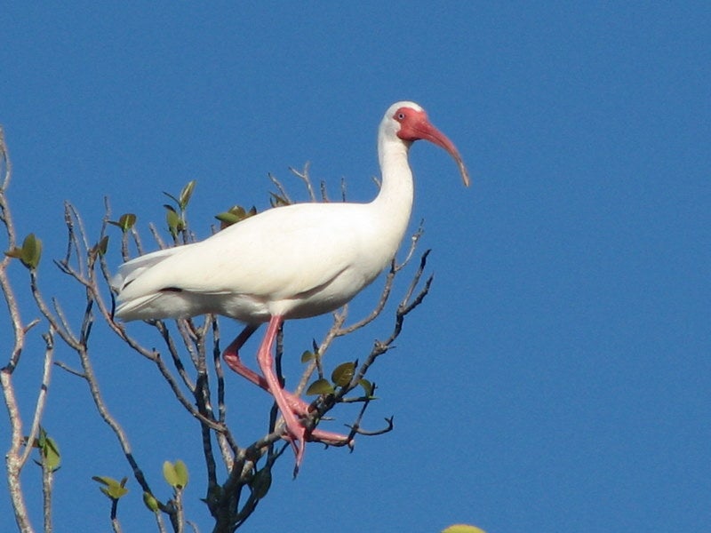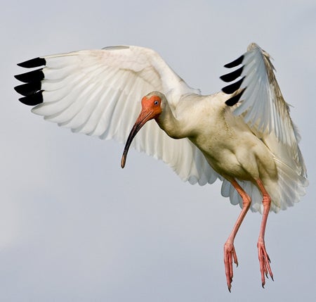 The white ibis has a solid white body except for black wing tips. Their head, bill, and legs are a vivid red color. The size of their long, curvy bills vary, and so does their body size. Adults weigh around two pounds, are about 24.5 inches in length, and have a wingspan of approximately 40 inches. White ibises can be commonly seen flying in large “V” type formations.