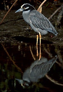 The yellow-crowned night heron (Nycticorax violaceus) averages about 25 ounces in weight and is about 22-28 inches long. Their wingspan is a little less than four feet. It has long yellow to orange legs and a gray body. They have a black head, black bill, red eyes, white cheek patch, and a yellowish-white crown. Males and females look alike. Their call sounds like a loud squawk.