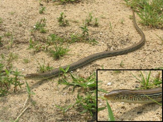 A legless lizard attaining a maximum length of about 42 inches. Individuals are tan or brown on top and light colored below with a series of dark stripes along the sides and sometimes down the center of the back. Two other glass lizards are found in Alabama; the eastern glass lizard (Ophisaurus ventralis) and the mimic glass lizard (Ophisaurus mimicus). The best way to distinguish the slender glass lizard from the other two species is the presence of dark stripes below the lateral groove running along the sides of the lizard. Glass lizards get their common name from their easily broken tail which often breaks into one or more pieces when grabbed or handled roughly. Though outwardly snake-like in appearance, glass lizards have external ear openings and moveable eyelids which are absent in snakes.