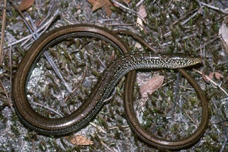 A long, slender, limbless lizard superficially resembling a snake, relatively recently described (Palmer 1987). Glass lizards distinguished from snakes by presence of a lateral fold along each side of body, moveable eyelids, a pair of ear openings, and scales reinforced with bony plates (osteoderms), making their bodies feel relatively rigid. Mimic glass lizards are easily the smallest of three native Alabama species of Ophisaurus,with a maximum snout-vent length (SVL) of 181 millimeters (7.1 inches) (Palmer 1987).