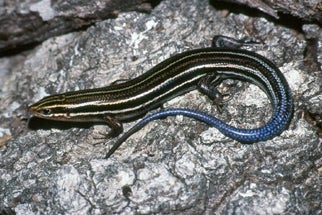 A brightly colored, medium-sized (16.5-2.4 cm [5.5-8.5 in.] long; max. snout-vent length = 89 mm [3.5 in.]) lizard (Conant and Collins 1991). In both sexes, tail slightly longer than body; breaks off when seized, but regenerates quickly. Adult males larger than females and ratio of head to body size greater in males than females (Vitt and Copper 1986). Covered with highly polished, overlapping scales (Mount 1975). Juveniles display bright blue tail and five prominent yellow to orange longitudinal stripes against a blackish to brownish ground color. Younger individuals display brighter stripes of oranges and reds on heads, noticeably contrasting with dull orange-yellow stripes on remainder of body (Palmer and Braswell 1995). The five lines are comprised of a singular mid-dorsal stripe, a pair of dorsolateral stripes, and a pair of lateral stripes (Mount 1975). In some juveniles, a pair of additional faint stripes running along the sides of the belly is visible (Palmer and Braswell 1995). Juvenile pattern may persist on mature females, but typically overall colors and patterns transform with age (Mount 1975, Conant and Collins 1991). At maturation, blue color of tail fades into a grayish or brown color, but a purplish hue may endure throughout life (Conant and Collins 1991). Stripes fade with age, but remnants remain in mature individuals. Older males may become a uniform bronze, tan, or olive ground color with broad, dark, lateral stripes. Heads of mature males typically swell and turn red or orange, especially on jaws. Very old males have completely red heads, but females do not (Mount 1975, Conant and Collins 1991, Palmer and Braswell 1995). In appearance, very similar to two other members of the “five-lined” skink group: the five-lined and broad-headed skinks. Colors and patterns alone are not useful characteristics to differentiate among these three species. However, the combination of five-stripes and a blue tail readily identifies younger individuals as members of this triad. Capture and inspection of midventral scale row located under the tail necessary to definitively and accurately classify individuals into one of these three species. Southeastern five-lined skinks have scales in this row that are nearly equal in width to adjacent scale rows, especially at the base in a non-regenerated portion of tail. In the other two species, this row is noticeably wider than adjacent scale rows at the base of tail (Barbour 1971, Mount 1975, Conant and Collins 1991, Palmer and Braswell 1995). Additionally, the dorso-lateral stripes of the southeastern five-lined skink cover the fifth (or fourth and fifth) scale rows, counting from the mid-dorsal row, but in the other two species the dorsolateral stripe is on the third and fourth (or fourth) scale rows (Barbour 1971; Martoff et al. 1980). Southeastern five-lined skink tends to have a narrower mid-dorsal stripe than the five-lined skink (Mount 1975). Electrophoretic data suggest the three form a monophyletic group with the southeastern five-lined skink and the broad-headed skink being the closest to a presumed common ancestor (Murphy et al. 1983).Southeastern five-lined skinks, occupying coastal islands and outer banks of North Carolina, have smaller scales around tail and body than mainland individuals (Palmer and Braswell 1995).