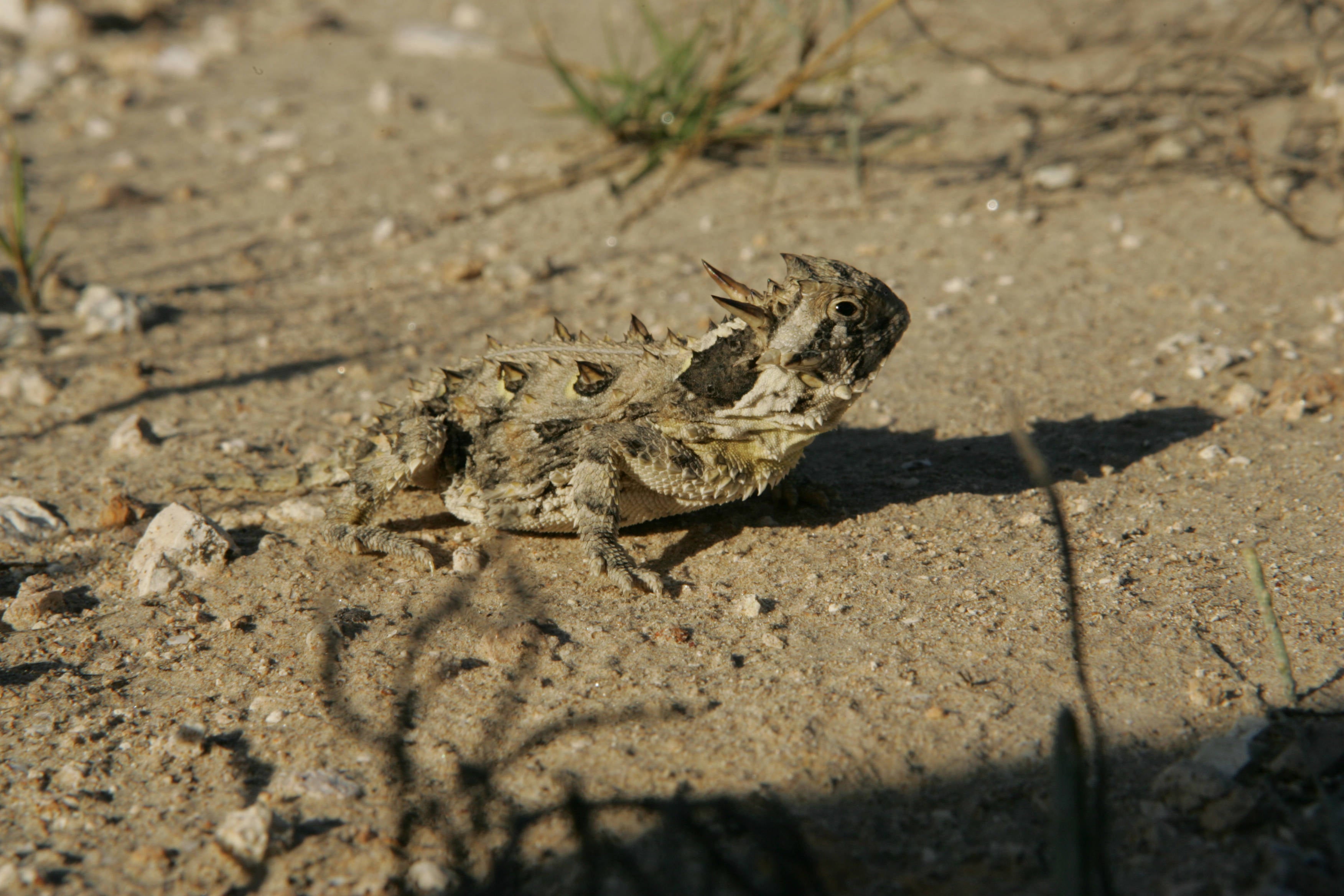 A flat bodied, fierce looking lizard from 2.5 to 7 inches in length. True to its name the Texas horned lizard has a large crown of spines on its head, with the two center spines being the longest. Two rows of fringed scales run down each side of the lizard. Generally brownish or sandy in color, most have dark spots that help them blend into their environment. Dark lines radiate from the eye. Even thought this lizard appears fierce, it is perfectly harmless.