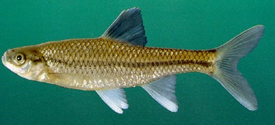 CHARACTERISTICS: This species has a moderately deep, compressed body, a small head, a blunt snout, and a small, almost vertical mouth. Body scales are heavily outlined with melanophores, giving them a diamond shaped appearance. A slender, dark lateral band extends from the gill opening to the caudal fin base. The dorsal fin of breeding individuals is heavily pigmented except for a clear white "window" in the middle. The caudal, anal, and paired fin membranes are pigmented and may be faintly shaded with pink or red. The tips of the paired fins and anal fin are usually white.