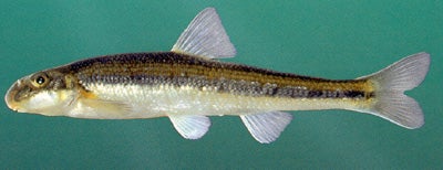 CHARACTERISTICS: The riffle minnow has a cigar shaped body tapering to a slight peduncle toward the tail. The head is large, the snout blunt and rounded, and the mouth small, with thick lips expanded into corner lobes. The eye is small (about half the snout length), and the wide lateral band extends from the snout to the caudal fin. All the fins have rounded edges and lobes. In life, the snout and paired fins have some orange color. Scales are small all over the body, and life color is olive brown along the back, grading to white on the venter. See Jordan (1877a) for original description.