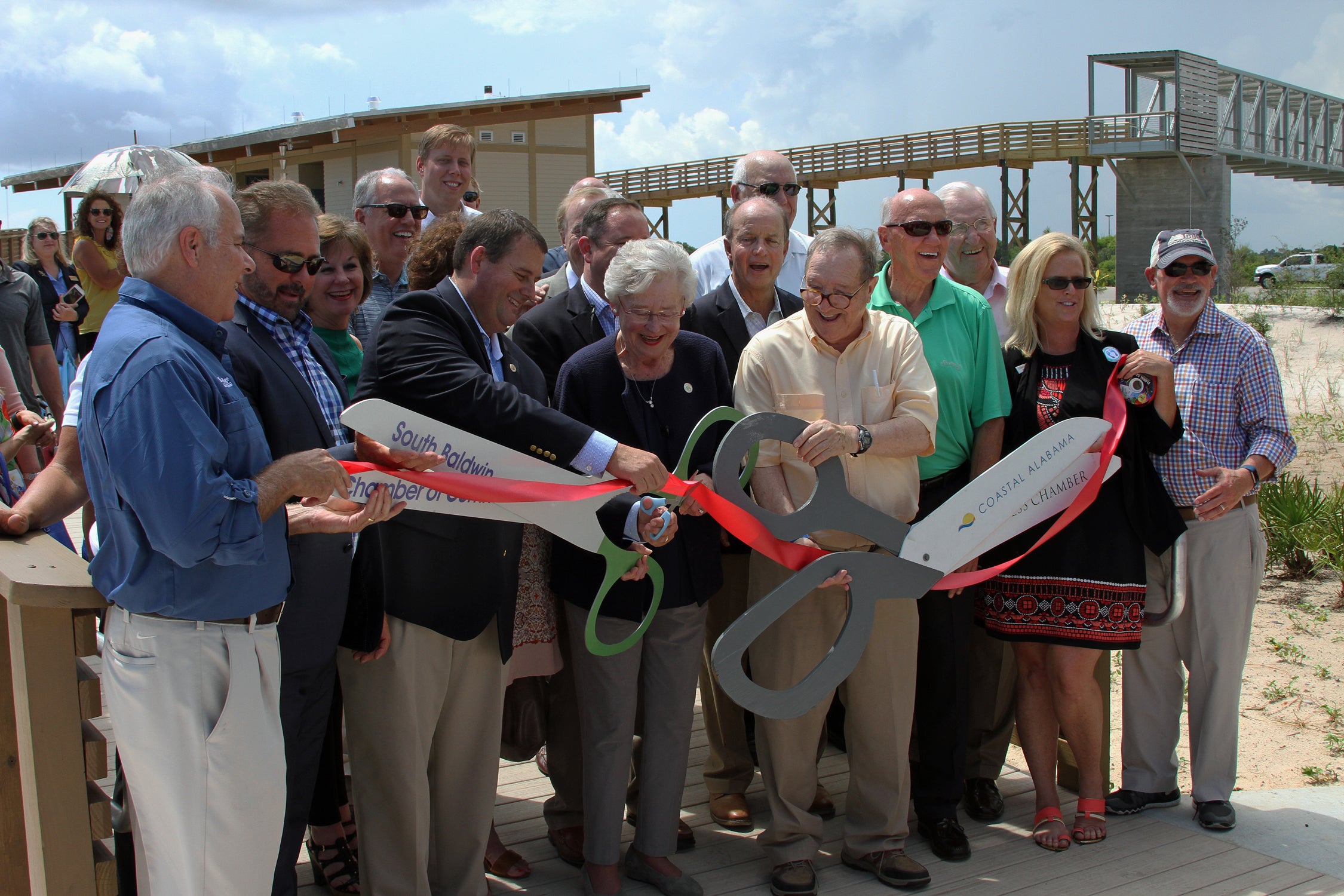 Gov. Ivey, Conservation Commissioner Chris Blankenship and other dignitaries cut the ribbon to the entrance of the Interpretive Center and Pedestrian Bridge, two significant parts of the Gulf State Park Enhancement Project located adjacent to the park’s Beach Pavilion.