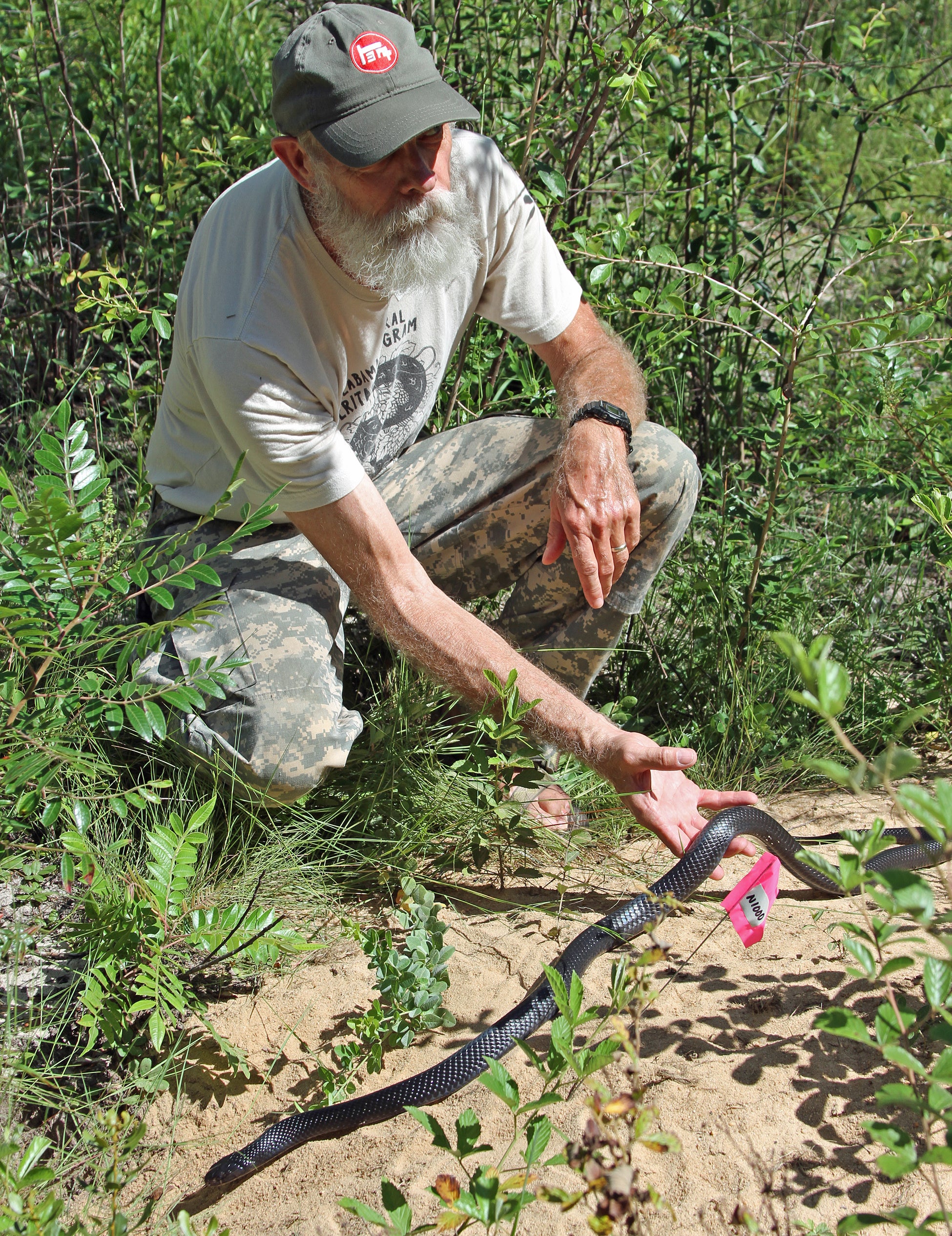 Technicians from the Auburn School of Forestry and Wildlife Sciences and the Auburn Museum of Natural History were out looking for documentation of indigo snakes as part of the long-term program to re-establish viable populations of Eastern indigos in their native habitat, mainly in longleaf pine forests in central and south Alabama.