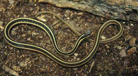 The eastern ribbon snake is a small nonvenomous snake that gets its name from its very thin body. At maturity adults can range from 16-28 inches long. Its color scheme consists of a brown back and white belly with two light yellow lateral stripes running down the side and one light yellow vertebral stripe down the center of the back. The lateral stripes are separated from the belly by a golden, brown or yellowish orange middorsal stripe. The Ribbon Snake has a sequence of 19 keeled scales, which are rough to the touch with a ridge in the center of each scale. Lip scales are uniformly yellowish or white with no markings between them. The tail of the Ribbon snake accounts for about one third of total body length.