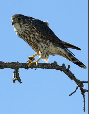 Merlins are one of the smaller raptors found in North America. The Merlin is also known as the “pigeon hawk” but is not closely related to hawks. The Merlin is a falcon that is approximately 9-13 inches in length with a wing span of 21-27 inches. Like most birds the males and females have different coloration. The males are a grayish blue to dark brown on their backs. They have dark brown to blackish streaks running from the crown of their heads down to their shoulders and back. The under parts are a cream or buff color with vertical dark brown to blackish streaks. The males have an unmarked white throat and the tail is barred with dark brown or blackish bands and has a white tip. In contrast, the females have dark brown backs, light brown streaks on their throat and a dark tail with buff colored bars and a white tip. Both sexes have yellowish legs and feet and a bluish, hooked beak.