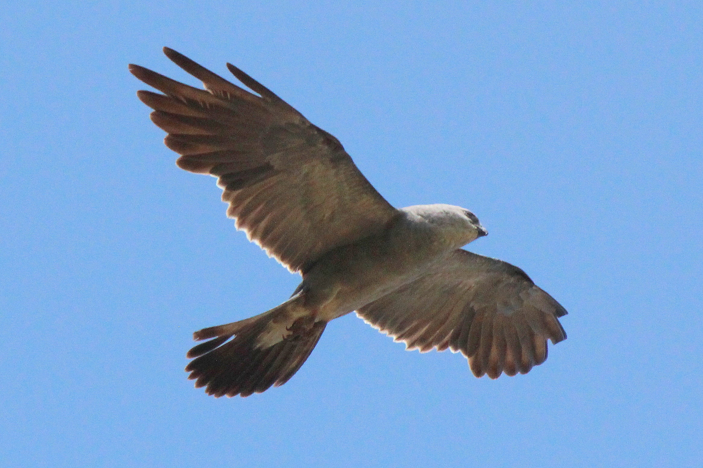 Mississippi kites belong to Class Aves, Order Falconiformes, Family Accipitridae and Genus Ictinia. The Mississippi kite varies in length from 12 to 15 inches, weight is eight to 13 ounces, and wingspan is 41 to 44 inches. The adult Mississippi kite has a white to pale gray head, with black around the eye. The upper wings are slate gray and the upper secondary wing feathers white. When seen in flight and from below, the body looks light to medium gray with the wings a darker gray. The tail is square, blackish and sometimes slightly notched. Young kites have a brown streaked breast with a banded tail.