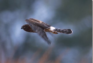 A medium-sized (43-58 cm [17-23 in.]; Nat. Geog. Soc. 1987), slim, long-tailed, long-legged hawk with a characteristic facial ruff that gives it an owl-like appearance. Sexes dichromatic, but both have conspicuous white rump patches. Adult male pale gray above and white below with reddish spots on underparts; wingtips edged in black. Adult female 12.5 percent larger and 50 percent heavier than male; predominantly dark brown above, light buffy below, with some streaking on underparts. Immatures resemble females; brown above, but reddish below (MacWhirter and Bildstein 1996). During courtship, both sexes emit a rapid series of kek or quik notes. Distress call similar, but given at higher pitch. Two subspecies recognized: larger northern harrier (Circus cyaneus hudsonius) and Eurasian hen harrier (C. c. cyaneus ) (MacWhirter and Bildstein 1996).