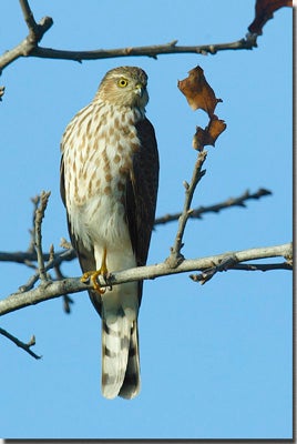The sharp-shinned hawk belongs to the hawk family Accipitridae. Accipiter hawks have short, rounded wings and long tails. The wings allow them to fly rapidly with short wing beats that are interrupted by glides. The long tail acts as a rudder for quick maneuverability. The sharp-shinned hawk is the smallest of the accipiters. Adult males are 9 to 11 inches in length, with a wingspan of 20 to 23 inches, and weigh three to four ounces. Adult females are larger, with a length of 11 to 14 inches, wingspan of 23 to 27 inches, and weigh 5 to 8 ounces. The sexes are very similar in plumage. Adults have a slate blue back and a dark head and neck that give a hooded appearance. Underneath they are white with rust-colored barring across the breast. Immature birds have brown streaking on the breast. Adults have dark red eyes and yellow legs. The long tail has dark and light banding with a thin white band across the tip. The sharp-shinned hawk is very similar in coloration to its cousin, the Cooper’s hawk. The Cooper’s hawk is a larger bird, 14 to 20 inches in length. It has a more rounded tail tip with broad white band across the tip, compared to the square-tipped tail and thin white band of the sharp-shinned hawk. The call is a rapidly repeated, thin “kiu,kiu,kiu” cackle of 15 to 20 notes.