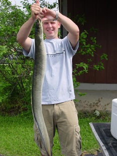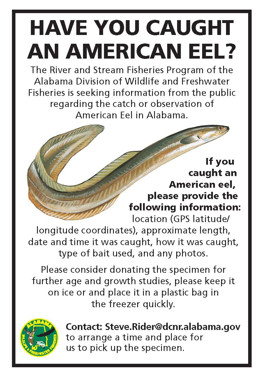 Recent records of American eels in the Tennessee River of Alabama are rare. Lee (1978b) included one record from a southern tributary. Feeman (1987) reported a specimen from the Paint Rock River downstream of the junction of Estill Fork and Hurricane Creek in Madison County. In 1993, we collected and released American eels at two stations in the drainage, one in Estill Fork of the Paint Rock River and another in the lower reaches of Cypress Creek in Lauderdale County. American eels have been collected from every river system in the Mobile basin as well as from several coastal drainages in southeastern Alabama. Although eels are known from downstream, none were collected in the Escatawpa River system in Alabama, probably due to limited boat access and insufficient sampling with proper gear. Inland distributions of American eels and several other fish species may have declined in recent years because of their inability to navigate over or through high-lift locks and dams. The greatest eel concentrations occur in the southern half of the state, particularly in the Mobile Delta. Angler reports supplemented by sampling efforts indicate a progressive decline in abundance with each upstream dam.