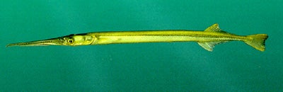 The distinctive Atlantic needlefish has a long, slender body, elongated jaws with numerous sharp teeth, and dorsal and anal fins placed at the back of the body. The tip of the lower jaw extends slightly beyond the upper jaw. The body is generally translucent and light yellow to yellow-green above the lateral line, grading to silver below. A dark green stripe occurs on the midline of the back, and a narrow, bluish silver stripe runs along the sides. The fins are yellowish along the edges.