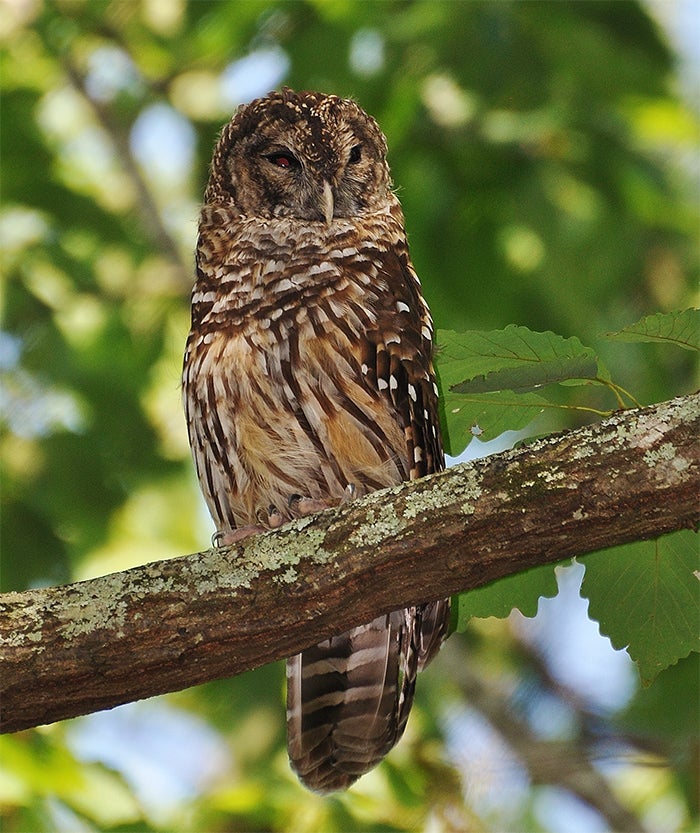 Barred owls belong to Order Strigiformes, as do all birds who have relatively large, round heads with eyes fixed in their sockets. More specifically, they are members of the Family Strigidae.The barred owl is one of Alabama's larger owls, with adults attaining lengths of 20 to 24 inches with wingspans of 40 to 50 inches.Their general appearance is somewhat chunky with a thick body and short tail.