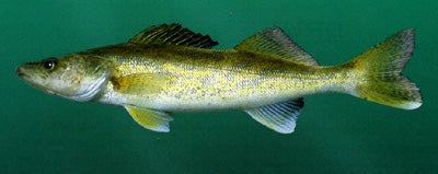 The walleye is similar in appearance to the sauger but can be distinguished by the large black spot at the posterior base of the walleye’s spiny dorsal fin and by the white tip on the lower lobe of the caudal fin. Walleye have a large horizontal mouth with large pointed teeth. The body color is olive to brassy yellow with extensive mottling along the sides and a white or light cream venter. The six to seven saddles on the back are diffuse and ill-defined. The soft dorsal fin and caudal fin rays are pigmented, producing a somewhat mottled yet banded pattern. Spots on the spiny dorsal fin are small with no definite pattern or banding. Like the sauger, the walleye has a characteristic lining behind the retina that makes the eye look silver.