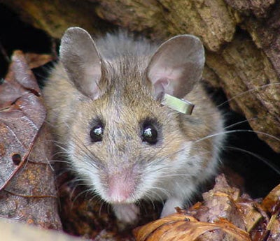White-footed deermice are nocturnal and active year round. They live primarily on the ground but are to an extent arboreal. These deermice do not make runways but will use burrows of chipmunks and other animals. Nest sites are commonly found above ground in hollow trees, woodpecker holes, birdhouses, or leaf nests of squirrels. Ground nesting areas include stone or trash piles, caves, rock crevices and buildings. Nests are globular structures six to 10 inches in diameter and are composed of soft materials including grass, leaves, paper, feathers and cloth. White-footed deermice undergo one complete molt per year, usually in the fall, and may also undergo a partial molt. The first litter of the year is usually born in April after a 23 to 25 day gestation period. Three more litters of one to seven young may be born before November. Young are born blind and hairless and weigh about 1/10 of an ounce. Eyes open within 12 to 14 days and young are weaned in 24 to 28 days. Females are able to breed at 10 weeks of age, and may be pregnant and lactating simultaneously. White-footed deermice are prey items for owls, foxes, weasels, cats, and snakes.