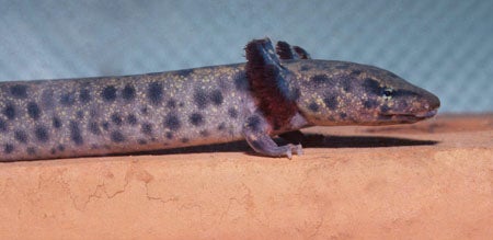 The Gulf Coast waterdog is an aquatic salamander 6.25 to 8.75 inches in length. Ground coloration is dark brown, but may appear much lighter due to multiple tan spots that join to form a net-like pattern. The spots are irregularly shaped and arranged. Some specimens have a dark stripe through the eye. Juveniles are lighter, with small dull yellow spots that darken as the salamander matures. They have four toes on all four feet.