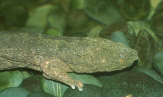 Larval hellbenders have external gills. At approximately 18 months of age, larval hellbenders go through a complete metamorphosis, at which time they lose their gills. Adult hellbenders usually retain a single pair of external gill openings on either side of the neck. Hellbenders have very small eyes located on the top of the head that can detect light but are not very good for forming images.